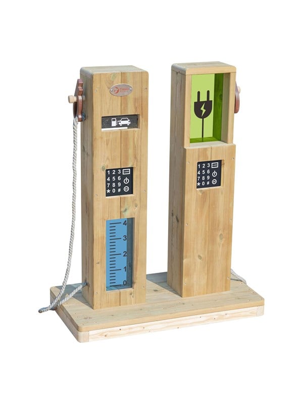 Classic World udendørs legetankstation i træ med to funktioner: tankning og opladning af elbiler. Børn kan parkere deres trehjulede cykel eller løbecykel og bruge tankstationen til rolleleg. Legestationen er lavet af træ og måler 88 x 70 x 38 cm. Velegnet