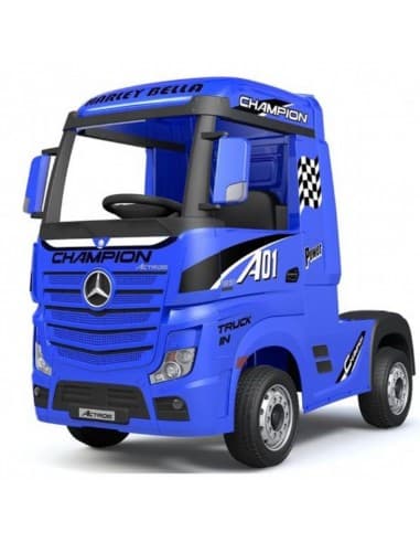 Elektrisk 4x12V Mercedes Actros lastbil til børn, udført i et design af blå og sort metal og kunststof. Elbilen passer til børn i alderen 3 – 6 år og måler 102 cm i højden og 126 x 68 cm i længde og bredde. Til bilen medfølger en fjernbetjening til voksne