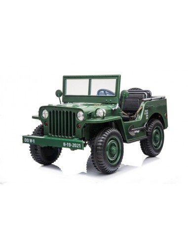 Elektrisk 4x24V Militær Jeep bil til 3 børn, udført i et design af grøn metal og kunststof. Elbilen passer til børn i alderen 3 – 7 år og måler 82 cm i højden og 163 x 81 cm i længde og bredde. Til bilen medfølger en fjernbetjening til voksne, der kan sty